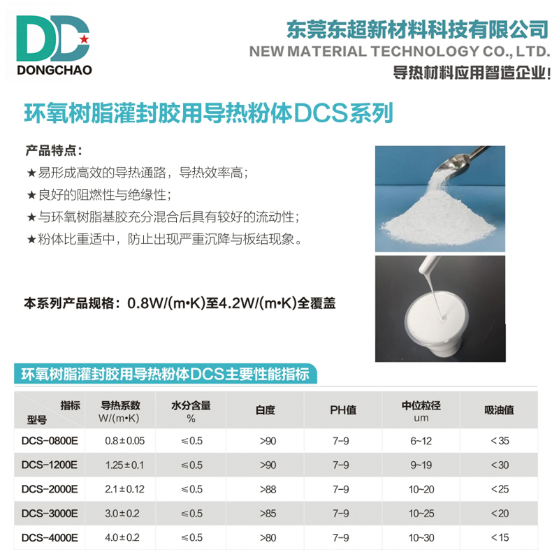 东超新材:靶向破解,提供系统性解决方案 面对这些行业共性难题,东超新材凭借深厚的粉体表面处理与复合材料设计经验,推出了专门针对环氧树脂体系的高性能环氧树脂灌封胶导热粉与环氧树脂粘接胶导热粉系列产品,为工程师提供了可靠的材料选择。 东超的核心技术优势在于创新的表面修饰与粒度级配设计。通过对导热填料进行专属的界面改性,东超导热粉与环氧树脂基体形成了强韧的化学与物理结合,显著降低了界面热阻,确保了热量在复合体系中的高效传递。同时,优化的颗粒形态与粒径分布,使得填料在实现高填充量时,仍能保持良好的体系流动性与操作工艺窗口。东超环氧树脂灌封胶导热粉 该产品系列环氧树脂灌封胶而设计。其卓越的导热增强效率,使得灌封胶在保持优异绝缘性、低收缩率和良好耐候性的同时,能快速将芯片或线圈产生的热量导出,保障器件长期稳定运行。东超DCS-4000E灌封胶专用导热粉,在特定配方体系中,可帮助灌封胶实现超过4W/(m·K)的导热率,同时保持优异的流动性和低粘度特性,满足自动化产线要求。