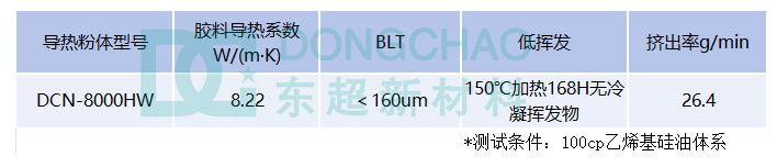 针对上述技术痛点,东超新材针对性研发了DCN-8000HW导热粉体,专门匹配8.0W/(m·K)低挥发导热凝胶的制备需求,其核心技术优势集中于先进的表面处理工艺创新:通过优化表面改性剂选型与处理参数,在提升粉体与硅油相容性、改善加工性能的同时,从源头抑制了挥发性物质的引入,从根本上解决了“高填充高导热”与“低挥发”之间的技术矛盾。